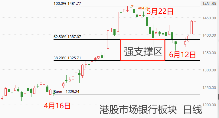 昨日,港股市场银行板块大涨3.06%,带动恒生指数出现2.87%的涨幅。此前的港股分析文章中提到,银行板块的0.382~0.618位置是强支撑区域,一旦板块指数在此处寻得支撑,后市或将展开剧烈涨势。果不其然,6月12日,银行板块触及阶段性低点,两日后形成底分形支撑结构,随后启动强势上涨走势。最近五个交易日连续收阳线,累计涨幅接近5%,远超同期其他板块表现。