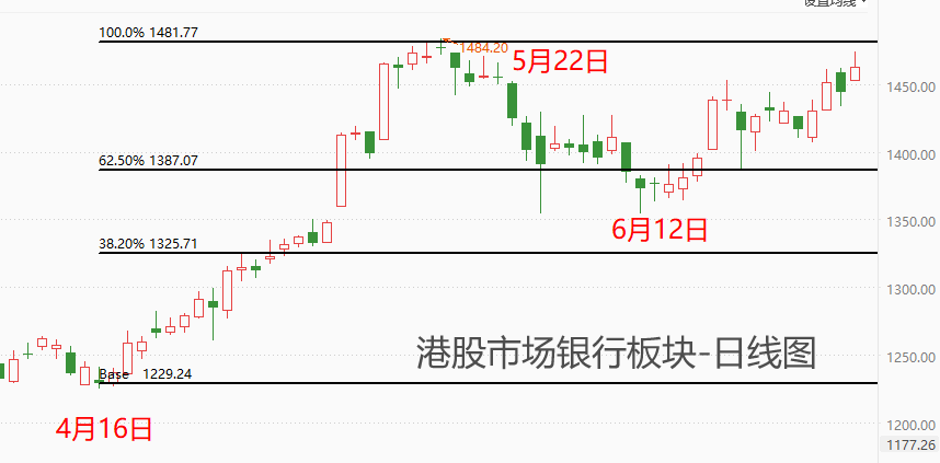 A股市场的银行板块指数的走势,与港股市场的银行指数相似,都处于长期多头趋势下的中期反弹阶段。A股市场历史最高点出现在2015年7月份,报价3881.67,当时内地房地产市场前景极为广阔,银行将大量信贷资金注入房地产市场,伴随楼市价格的飙升,银行板块的个股受追捧。今年5月22日,银行板块指数创出2021年以来新高。6月24日至今,累计涨幅超过4%,市价逼近5月22日高点。