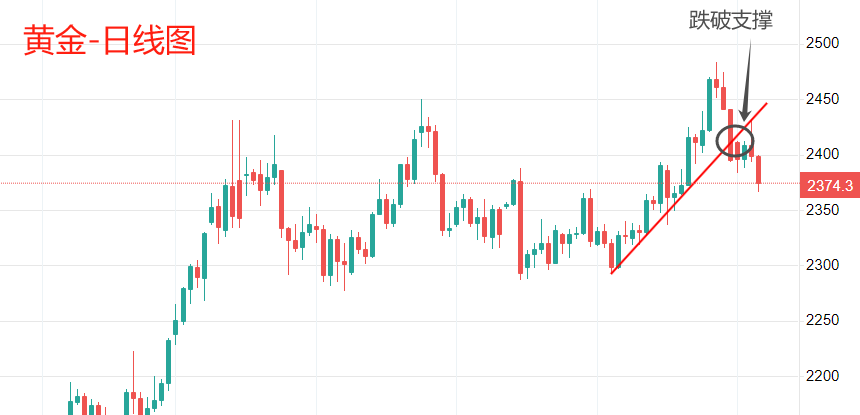 其二,黄金刚刚经历一轮暴涨行情,并在7月17日创出历史新高,当前正处于短线资金获利了结的回调状态。美股的下跌虽然能够小幅度提振黄金多头信心,但相比创新高后的获利回吐来说,力度明显偏弱。技术角度看,黄金现价2374美元,相比历史最高点2468来说,已经下跌94美元,跌幅3.8%。黄金市价重回震荡区间,本轮下跌有可能冲击震荡区间下限2300美元。