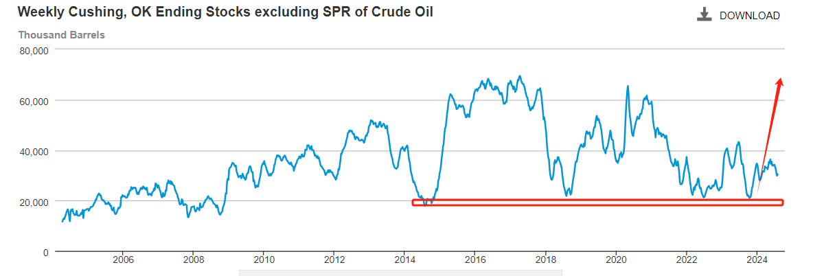 根据美国能源信息署最新数据,美国至8月2日当周EIA原油库存为减少372.8万桶,高于前值-343.6万桶,远高于-70万桶的预期值。库存下降利多WTI和布伦特原油价格。历史数据看,EIA原油库存已经连降六周,最大单周降幅高达1215.7万桶,创出2023年7月以来最大值,市场供需已经显露不平衡迹象。同一时间公布的还有美国至8月2日当周EIA俄克拉荷马州库欣原油库存,前值为-110.6万桶,预期值增加57.9万桶,这是最近五周以来的首次库存上升。俄克拉荷马州库欣原油库存虽然属于地区性库存,但由于该地区是纽交所原油的交割地,所以库存数据参考意义大于EIA综合库存数据。