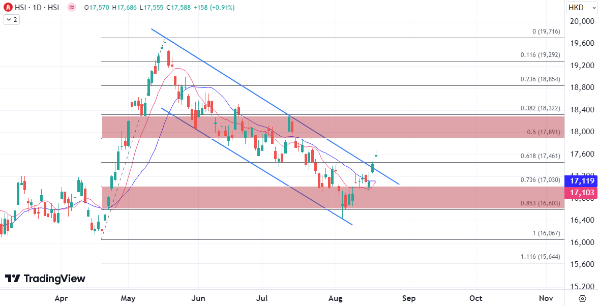 恒指连涨两周后日内外围指引保持利好,技术上也迎来突破的信号,上周相继突破均线和自5月高位以来的趋势线阻力,意味着将正式挑战18000关口,但预计通向该位的走势依然会略显挣扎,尤其是消息面如果没有利好刺激跟进的情况下,仍可能再次回到17100附近测试关键的支撑。
