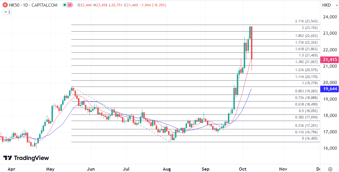 内地国庆黄金周长假后复市,今早恒指低开250点,失守两万三,高见22902点后跌幅显著扩大,一度将跌幅扩大至逾两千点,但低位有买盘支持,大市跌幅收窄。恒指半日收造21810,跌1289点或5.6%;国企指数半日收7820点,泻6.1%;科指曾大跌14.4%,半日收造4962,泻7.9%。