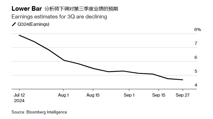 根据彭博编制的数据,分析师预计标准普尔500指数成份股公司的季度收益将较上年同期增长4.7%。商业银行的数据显示,这一增幅低于7月12日预测的7.9%,是四个季度以来的最低增幅。