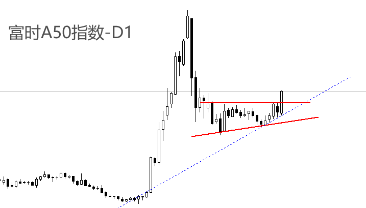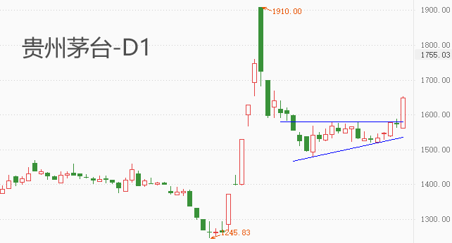 富时A50指数成分股当中,流动市值最大的个股是贵州茅台,其走势具有代表性。将贵州茅台的股价和富时A50指数的走势进行比较可以发现,两者的走势极为相似。贵州茅台日线级别,在今日大涨之前,同样出现了震荡走势,且震荡区间的下限有小幅升高的迹象。