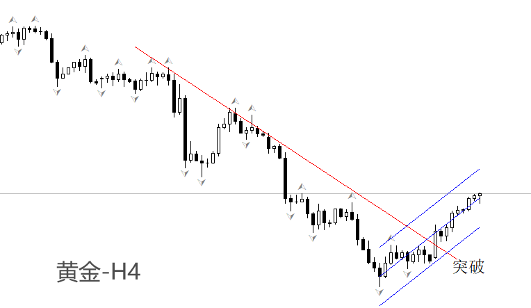 四小时周期看,黄金的中长期趋势依旧为空头,只不过最近两日迎来的幅度较大的反弹。红色下降趋势线已经在昨日6:00被突破,反弹走势出现级别升高。目前市价运行于蓝色回归通道内部,通道上柜和下轨对行情产生有效的阻力和支撑作用。考虑到本周没有重磅的经济数据和事件,黄金按照技术面逻辑持续反弹的概率较高。