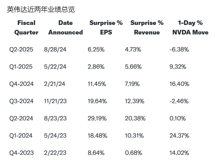 英伟达的股价在财报发布后的一个交易日内平均波动5.3%。最大单日涨幅出现在2024年第一季度财报之后,当时该股飙升24.4%,而最糟糕的反应出现在2024年第四季度财报之后,下跌了7.6%。