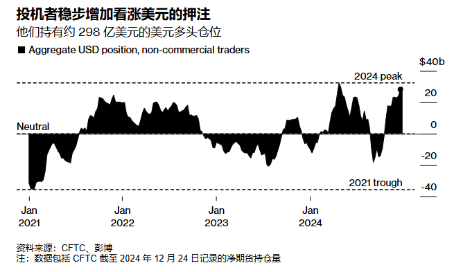 据彭博社汇编的数据,包括对冲基金和资产管理公司在内的一批市场参与者已将美元升值的押注总额增加至约298亿美元,是自4月份以来对美元最为看涨的持仓状态。然而,考虑到美元上涨的规模以及降息步伐放缓已基本被市场消化的事实,人们对美元还能走多远仍存在一些疑问。