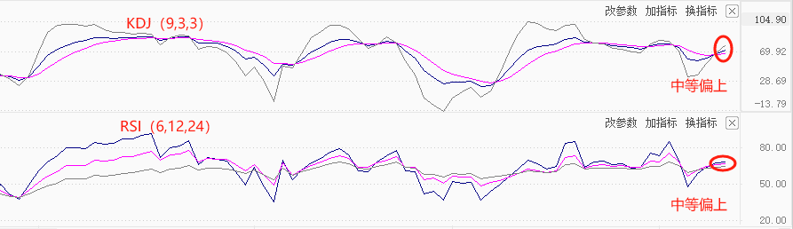 技术指标角度看,RSI(6,12,24)的读数介于64~68之间,均低于80的超买线,处于50中等线上方,意味着当前行情呈现多头趋势,同时存在一定程度的继续上涨空间。KDJ(9,3,3)的读数介于68~80之间,低于80超买线,高于50中等线,同样意味着当前行情存在多头趋势,但多头趋势偏弱。