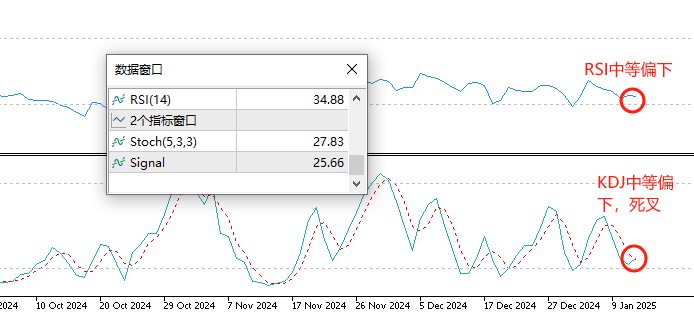 指标角度看,欧元日线级别,RSI的最新值34.88,虽然高于20的超卖线,但处于中等偏下水平,意味着当前行情的趋势偏空。KDJ指标的最新值为27.83、25.66,均高于20的超卖线,但快慢线处于死叉状态,空头趋势仍旧占据当前行情主导。