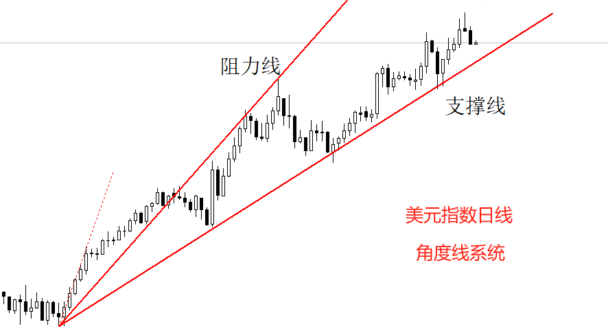 角度线角度看,2024年9月27日至今,美元指数的日线走势都处于红色支撑线上方,意味着该支撑有效果。9月27日至10月24日,美元指数涨势过于激烈,K线处于长期阻力位上方。10月24日之后,随着一轮回调走势的出现,K线进入阻力线下方。截至目前,K线没有再突破阻力线。角度线来看,未来行情报价将处于阻力线和支撑线之间,直至任何一方被有效突破。
