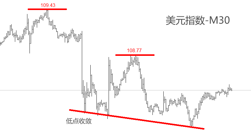 30分钟周期来看,美元指数的高点依旧在降低,1月20日亚盘时段高点为109.43,1月21日美盘时段高点下降至108.77,空头趋势仍然在延续。但是,从低点的排列来看,收敛程度不断加大,空头力量有所减弱。短期关注上方108.77阻力位和下方红色支撑斜线,如果向上突破阻力位,意味着美元指数的回调走势可能行将结束。如果向下突破支撑线,且低点重新进入扩散,则美元指数的跌势恐将延续。