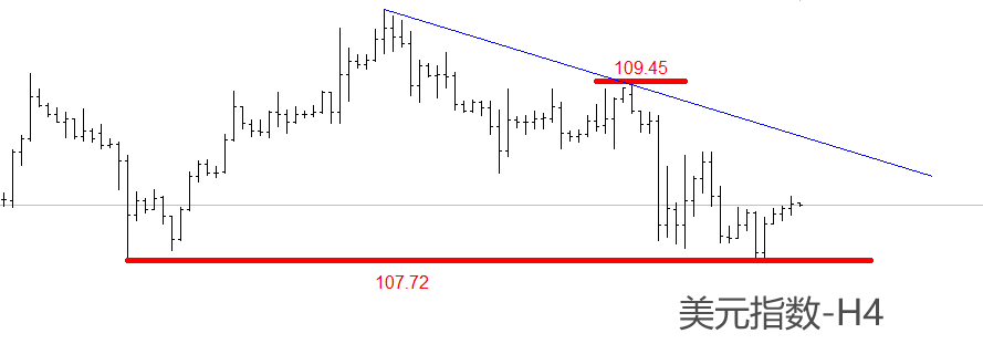 四小时周期来看,美元指数的走势与昨日的讨论相同:1月6日低点107.72是近期的显著支撑位,本周的最低点逼近该点位,且形成底分形结构,触底反弹的概率较高。20日亚盘时段的高点109.45高点可以看做信号点,一旦反弹突破该点位,则触底结构确认。另外一个更积极的信号是蓝色中短期下降趋势线,当市价触及趋势线的时候,也是触底结构确认的信号,但随着时间的延长,该信号的价值将有所下降。