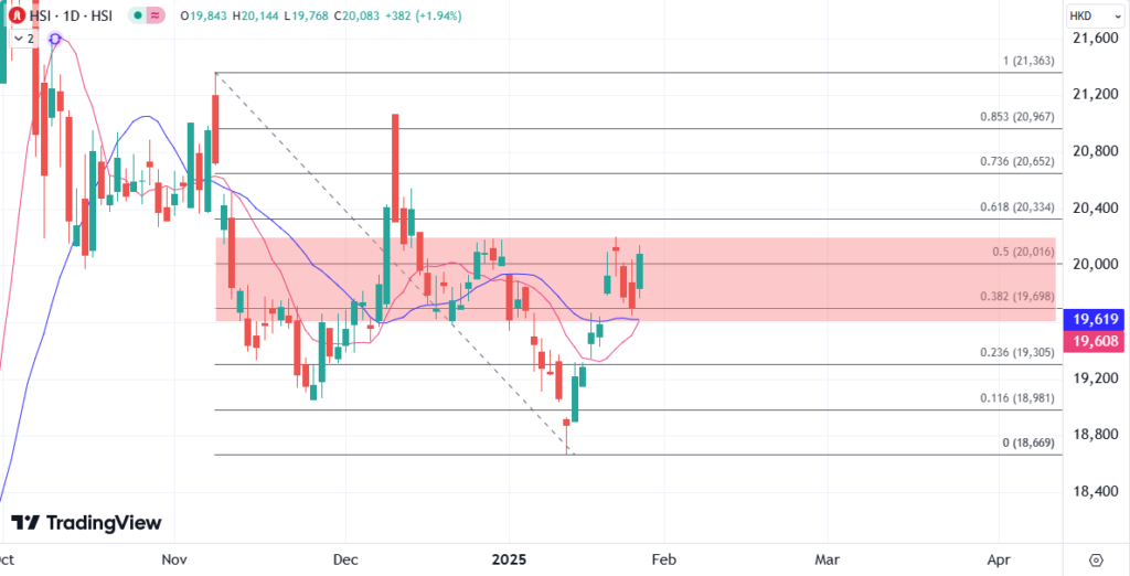 港股午后升穿上午高位,部分突显春节假期前的乐观氛围,重上两万点关口,本周以来一直在该关口上下震荡,下周内地进入长假,缺少部分资金和指引下预计港股会延续两万点的胶着,部分会跟随外围美股的行情,留意美联储1月利率决议的间接指引。技术上暂时考虑前期高位在20190为阻力,日图均线所在的19600为支撑。