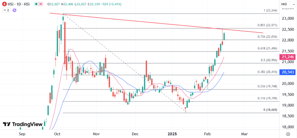 恒指本周以来累计上涨近5.5%,势将创下五周连涨的行情,将是2022年6月以来首次,资金面的乐观有望继续将恒指推向去年10月创下的高位,所以聚焦在23000关口为初步的目标,但留意高位趋势线的阻力。