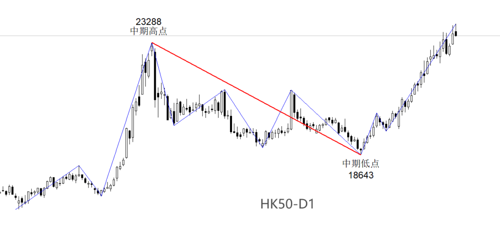 走势结构角度看,日线级别,HK50指数在去年10月份行形成中期高点23288,之后今年1月份形成中期低点18643,下一个中期高点尚未形成,最新市价已经突破前一个中期高点。在新的中期高点形成之前,预计多头走势将会延续。比例测算方面,按照摆动理论1:1的原则,前一轮中期下跌波段幅度为4645点,下一个高点可能在27933附近。需要提醒的是,比例测算不确定性较高,需要根据实时行情和最新消息综合判断、不断修正。