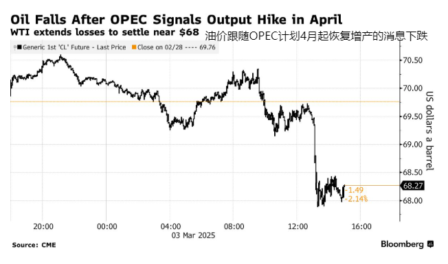 3月开局,原油价格随即遭遇了一记重压——因OPEC计划在4月恢复增产,每天增加约 13.8万桶的产量,这是OPEC自2022 年以来首次增产,标志着该组织朝着解除220万桶/日的减产目标迈出了谨慎的一步。据OPEC内部人士透露,生产计划是从2026年4月到9月逐步取消220万桶/日的减产。