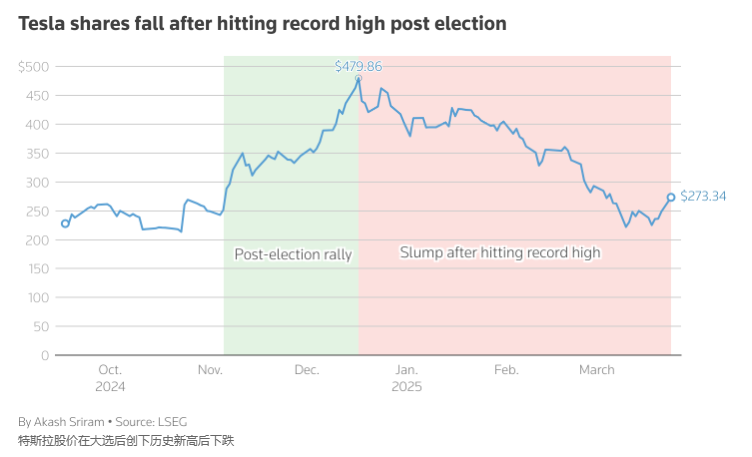 自去年11月特朗普当选后,特斯拉股价一路飙升,因为人们希望在新政府的领导下,该公司可以更容易地推出自动驾驶出租车,但现在特斯拉股价已较1月份的高点下跌近一半。即便经过了自上周的连续反弹,但特斯拉股价今年跌幅仍达到30%左右。据英国金融时报,随着特斯拉的市值在过去3个月里缩水一半,对冲基金卖空者已押注162亿美元做空特斯拉股票。