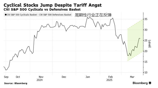 一些市场观察人士正在关注周期性股票相对于防御性股票的表现,防御性股票是担心经济的投资者的热门避风港。美国银行客户在此前一周,总体上对周期性股票的净买家多于防御性股票,这表明他们还没有为经济衰退做好准备。许多市场参与者认为,关税可能导致美国经济下滑,而这一因素尚未被市场充分定价。