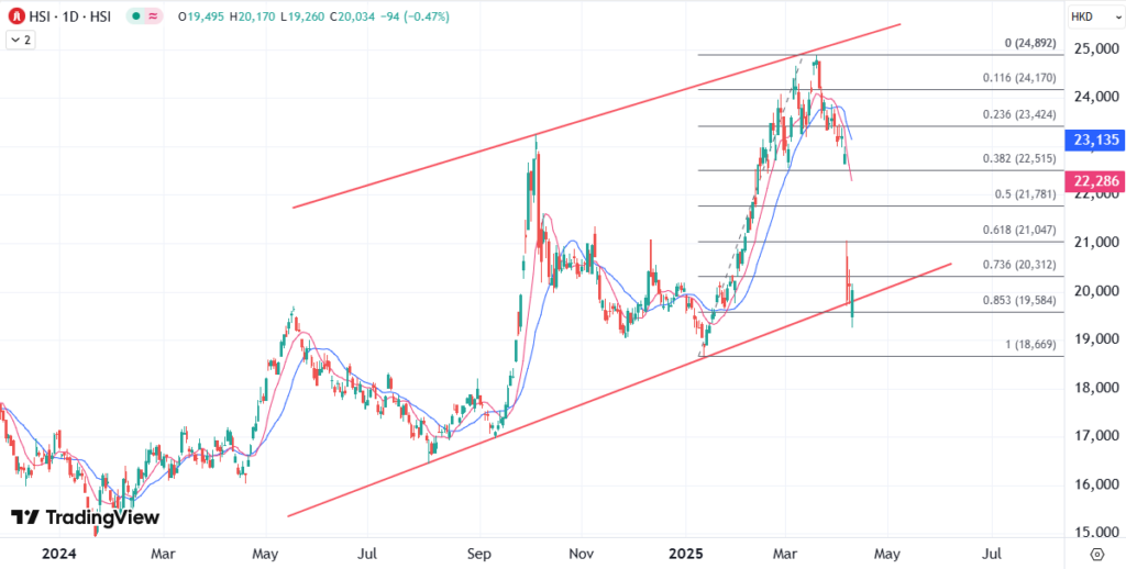 对等关税于北京时间中午生效,港股显著波动。恒指低开632点,初段跌867点一度低见19,260点后,其后在沪深股指反弹下,恒指跌幅一度收窄至108点见20,019点。半日跌312点或1.6%,报19,815点,午后大市跌幅收窄,重返20000点关口。