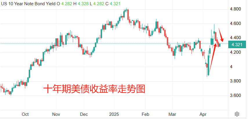 能够与黄金抗衡避险属性的产品,美债是首选。4月7日至11日,十年期美债收益率迅速升高,从最低3.86%涨至4.592%,涨幅超70基点。虽然债券收益率升高意味着市场正在抛售,债券价格降低。但是,对于一级市场来说,更高的收益率能够吸引更多的资金从黄金市场流入债券市场,间接抑制黄金的涨幅。然而,最近四个交易日,美债收益率持续回调,最新值为4.319%,跌幅27基点。正式在这段时间,黄金的价格趁势急速飚高。
