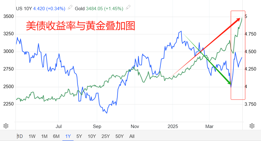 但是,4月4日之后,十年期美债收益率急速飚高,11日至16日虽有回调,但没有破会反弹结构,预计收益率将继续上升。同期,黄金不但没有出现回调,反而涨势加速,这才出现了上破3500美元的亮眼表现。逻辑上讲,黄金和美债收益率的背离走势无法持续,未来有可能出现黄金下跌回归美债收益率,或者美债收益率骤降以匹配黄金涨势的情况。