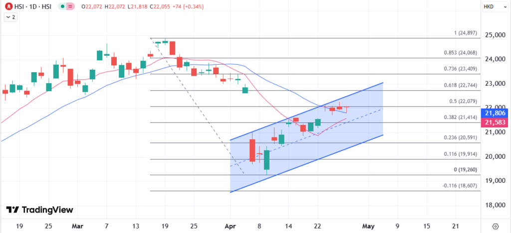 港股在周线连涨后,今日随着市场观望最新的贸易谈判进展和外围美国众多重要经济数据,恒指暂时维持22000关口上方的交投,继续守住日图主要均线上方为多头坚守月初以来的高位的关键,但是呈现高位的整理,需要关注一旦有利空消息很容易让恒指再次失势,尤其是在接近近期上行通道顶部的情况下。
