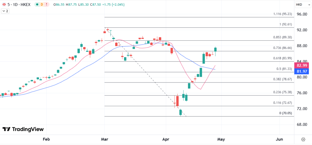营收与利润双双超出预期,加上回购计划,汇丰在午后的港股中撑起,尽管本月部分回吐,但汇丰今年的股价累计上涨近15%,仍远超过同行的平均表现,当前可以继续关注3月初高位在92港元上方为目标,但目前突破90港元对于技术上的反弹跟进为关键。在亮眼的业绩过后,市场也进一步关注宏观经济环境不确定性对于汇丰信贷损失的影响。数据显示,如果关税上调导致全球经济增长放缓,该行可能再计提5亿美元损失。