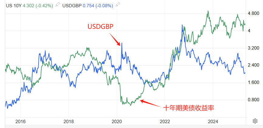 英国央行的基准利率和GBPUSD的共振性不明显。一方面是因为2022年之前,基准利率存在底部钝化迹象,波动性较差。另一方面是,英镑相比美元是弱势货币,美元指数更能主导GBPUSD的中短期走势。上图是USDGBP日线和十年期美债收益率的叠加图,虽然两者的涨跌幅度存在较大差别,但起涨/跌点、拐点出现的时间基本一致,两者共振性显著。这幅图佐证了GBPUSD主要受到美元指数和美联储货币政策影响的观点。