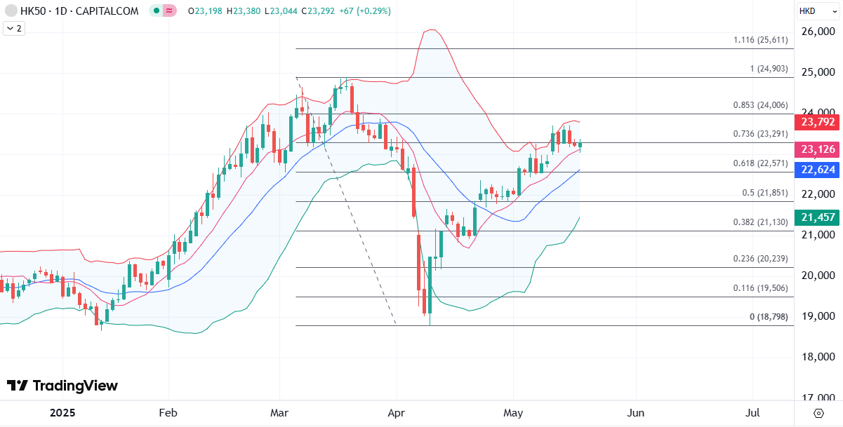 上周受到贸易局势缓和的推动,港股成功收复4月初失地,恒指周线上涨2%,为连升5周,周一开盘情绪收到外围美国被下调评级的影响,但是预计很快随着市场消化港股仍有望保持上行动能,关注来自10日均线及布林带中轨的重要支撑,阻力继续维持在上周主要交投区间,区间顶部的阻力在23700上方。