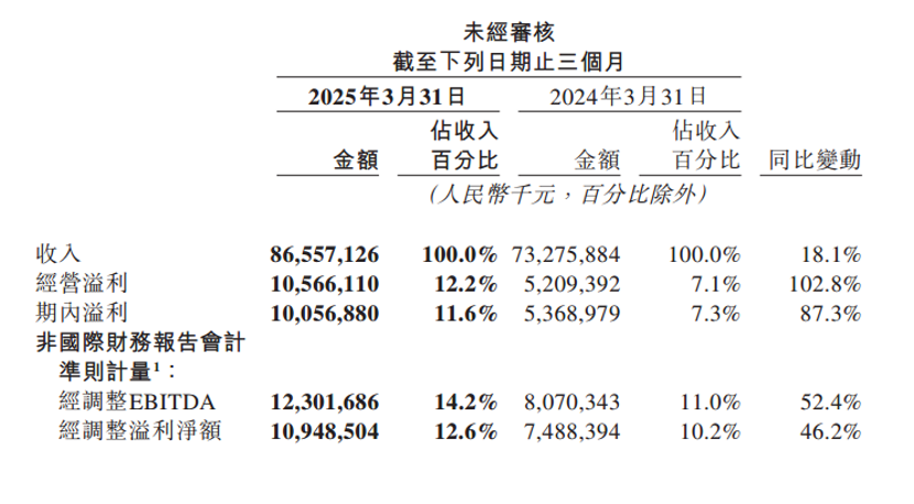 美团(03690.HK)在周一收市后公布2025Q1财报,该季度实现营收866亿元,同比增长18%。调整后净利润109.5亿元人民币,同比增长46.2%,市场预估97.3亿元人民币。新业务方面,一季度经营亏损同比收窄至23亿元。以一季度90天统计,美团日入营收9.62亿元,日赚利润1.22亿元。一季度销售毛利率为37.45%,相比去年全年的38.44%下降近1个百分点;销售净利润率为11.62%。