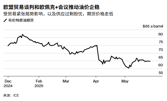 在OPEC+会议就供应政策做出决定之前,市场权衡欧盟与美国之间贸易紧张局势缓解的前景,美国总统特朗普决定将与欧盟的贸易关税谈判延长至7月9日,暂缓加征50%关税的决定,缓解了对关税可能抑制燃料需求的直接担忧。本周开局的国际油价持稳,但周二则连续第二日下跌,因市场愈发预期OPEC+将在本周晚些时候的会议上决定加快增产。