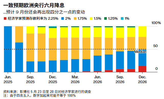 路透调查显示,经济学家预期,欧元区经济今年将增长0.9%,较4月份预测的0.8%略有上升,明年将增长1.1%。通胀预计将在下个季度达到欧洲央行的目标,比一个月前预测的2026年第一季度要早得多。基础设施和国防开支(特别是在德国),将有助于部分抵消关税战的负面影响。