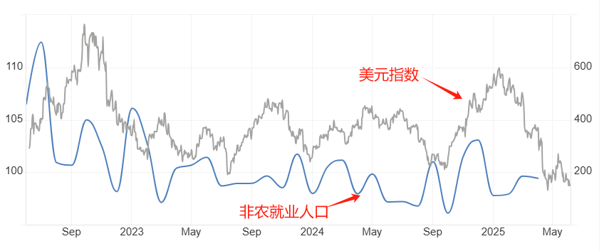 将非农就业人口数据与美元指数走势叠加,发现两者存在一定程度的共振性。2024年9月份之前,非农就业人口数据整体呈现重心下移的特征,同期的美元指数虽然波动性更强,但也表现出重心下移的特征。2024年9月份之后,美国新增非农就业人口数据4.4万人飙升至32.3万人,同期的美元指数也剧烈上涨。今年开始,美元指数持续下跌,市价已经从110上方跌至100下方。当美元指数处于弱势周期时,美国非农就业报告的表现预期偏差。