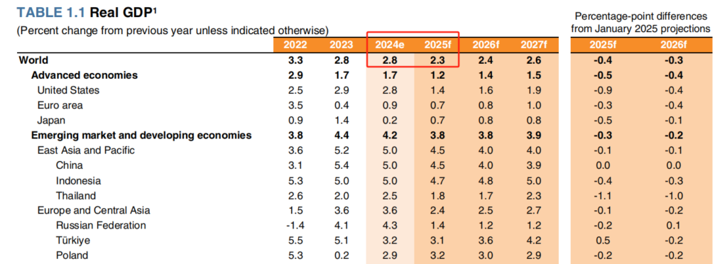 世界银行发布6月份《全球经济展望》,其中提到:经济动荡将使年初预计的全球GDP增长率下降近0.5个百分点,降至2.3%,这是17年来最疲弱的表现(除大流行期间的极端情况)。报告中主要对4月份美国总统特朗普发起的激进对外政策进行了分析,认为美国和全球经济都将受到该政策的负面影响。