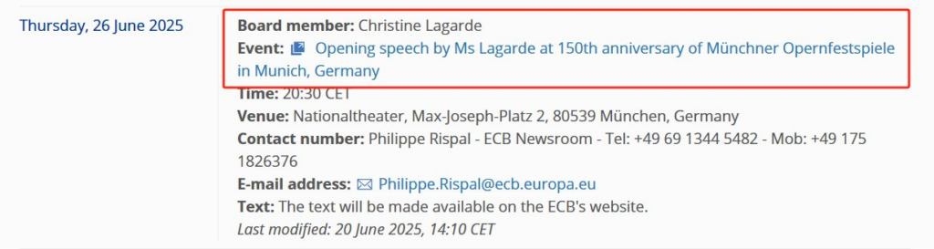 本周五02:30,欧央行行长拉加德将发表讲话,地点在德国慕尼黑。本次讲话是为了庆祝慕尼黑歌剧节150周年,拉加德做开幕致辞。考虑到本次活动与欧元区的经济关联不大,拉加德可能不会就利率路径、通胀、失业率等内容发表评论。本周一21:00, 欧洲央行行长拉加德将在欧洲议会经济与货币事务委员会举行的听证会作介绍性发言,地点在布鲁塞尔欧洲议会。6月9日,拉加德曾讲话称,“我们目前处于有利位置,欧元表现良好”。过去两周时间,欧元区的宏观经济没有明显变化,预计拉加德的讲话将延续一贯的乐观风格,大概率将对欧元产生利多提振。