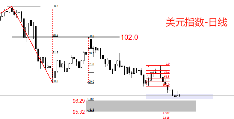 走势结构角度看,日线级别,美元指数处于中长期空头趋势之中,最新波段为下跌,近期跌势有趋缓迹象。最新市价位于前一轮小反弹的1.382~1.618分位之间,可能获得短期支撑。最近三个交易日存在止跌震荡的迹象,上述支撑区域正在发挥作用。前一轮大反弹的1.382~1.618分位是95.32~96.29点,该区间可以看作美元指数下跌的震荡支撑区。如果市价跌至该区间,有望获得更强的支撑作用。