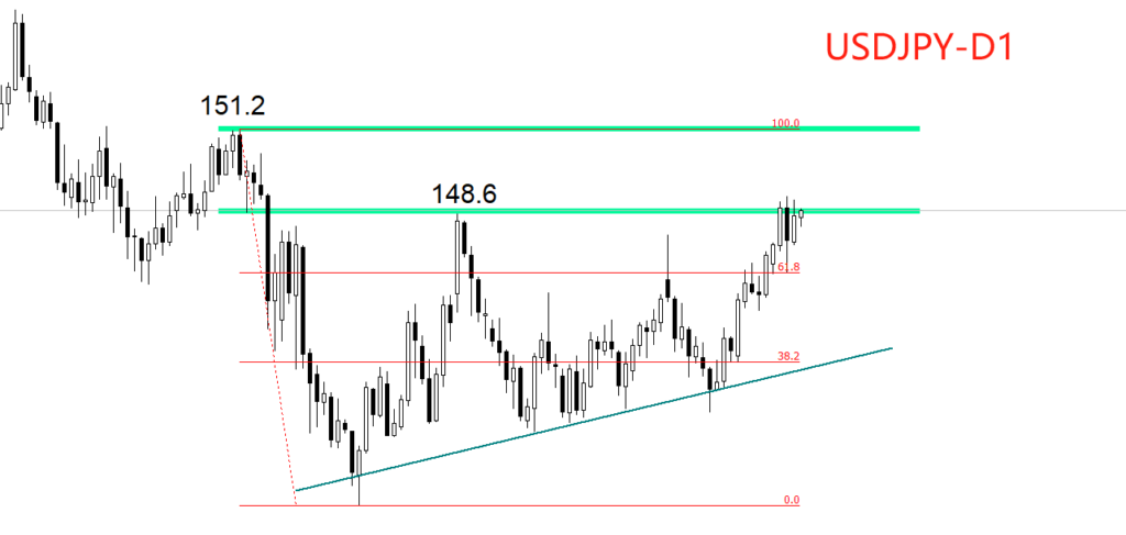 走势结构角度看,日线级别,USDJPY处于中长期空头趋势之中,近期有筑底迹象,且以往经常出现大幅度反弹走势。最新波段为上涨,最高点149.17点,与前一个高点148.6较为接近。如果行情就此止步,则形成双顶结构,后市有回落可能。不过,黄金分割角度看,最新市价已经突破前一个显著下跌波段的0.618分位上方,即便开启回落走势,跌幅可能也比较有限。4月22日至今,可以画出中短期上涨趋势线,对当前行情有支撑作用,可以作为未来回落波段的目标线。