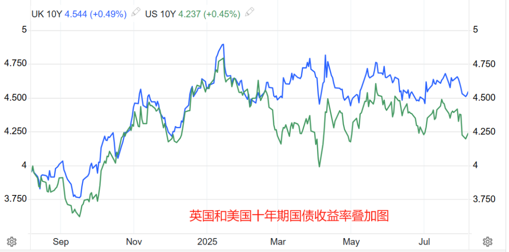 债券市场来看,英国十年期国债收益率与美国十年期国债收益率共振特征明显,并且英债的收益率略高于美债,这将维持英镑资产的吸引力,有助于抑制英镑的贬值走势。三个月期英债收益率为4.08%,六个月期英债收益率为4.04%,长短期国债收益率倒挂,意味着英国央行将会在3~6个月之间再次降息,这将持续利空英镑。
