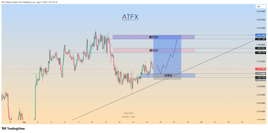 上图为黄金小时图走势,价格在 3350 附近形成支撑区,短线多头有望借助该位置展开反弹,目标首先看向 3380-3385 区间的阻力位1,进一步突破则可能挑战 3397-3401 阻力位2。若价格回踩支撑位不破并沿上升趋势线反弹,将验证当前市场对美联储大幅降息的交易押注。