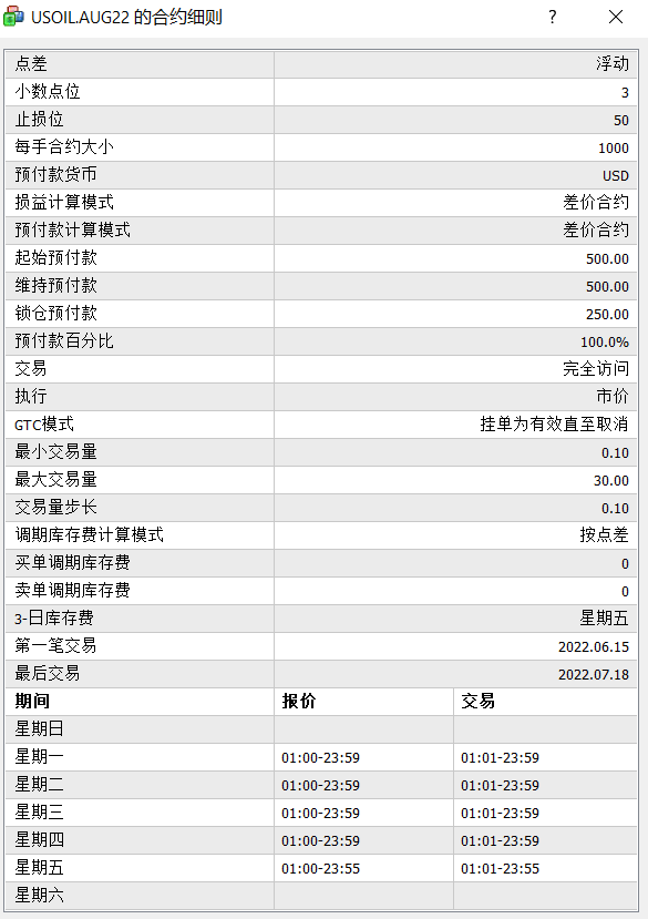ATFXGM的2022年8月份美国WTI原油期货合约(8月美国原油)到期日为2022年7月18日(星期一),如果在平台时间的2022年7月18日23:55,也就是北京时间的2022年7月19日04:55之前没有平仓的8月美国原油,系统将会自动按照当日收市价格平仓,请提前做好仓位管理。