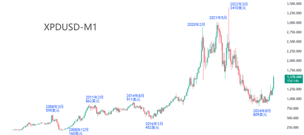 钯金,英文名 Palladium,MT4代码XPDUSD,是贵金属之一。钯金在地壳中的含量为0.001ppm(即0.001克/吨),是铂金含量的五分之一,是黄金含量的四分之一。虽然钯金在地壳中的含量远低于黄金和铂金,但是从报价来看,钯金的价格仍低于黄金和铂金。比如,2025年9月24日,黄金的报价为3767美元,铂金的报价为1478美元,钯金的报价为1240美元。钯金报价约为黄金的三成,与铂金的报价较为接近但仍有差距。需要提醒的是,价格关系并不固定,随着供需的变化,钯金的价格也有可能高于黄金,比如2021年4月份,钯金收盘价2953美元,高于同期黄金收盘价1768美元。